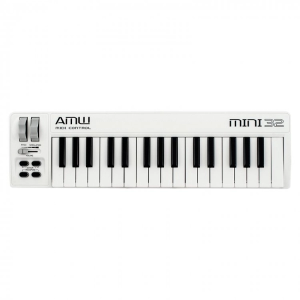 O controlador AMW Mini 32 White representa o melhor que você pode encontrar em matéria de custo benefício dentro do Brasil. Um controlador Midi com 32 teclas compactas sensíveis ao toque, roda de modulação, pitch bend e botão de oitavas. Outro detalhe incrível é um controlador midi nessa faixa de preço possuir função transpose, fader programável e entrada para pedal de sustain. Um produto portátil com excelente desenho e que se tornou o controlador midi mais vendido do Brasil.